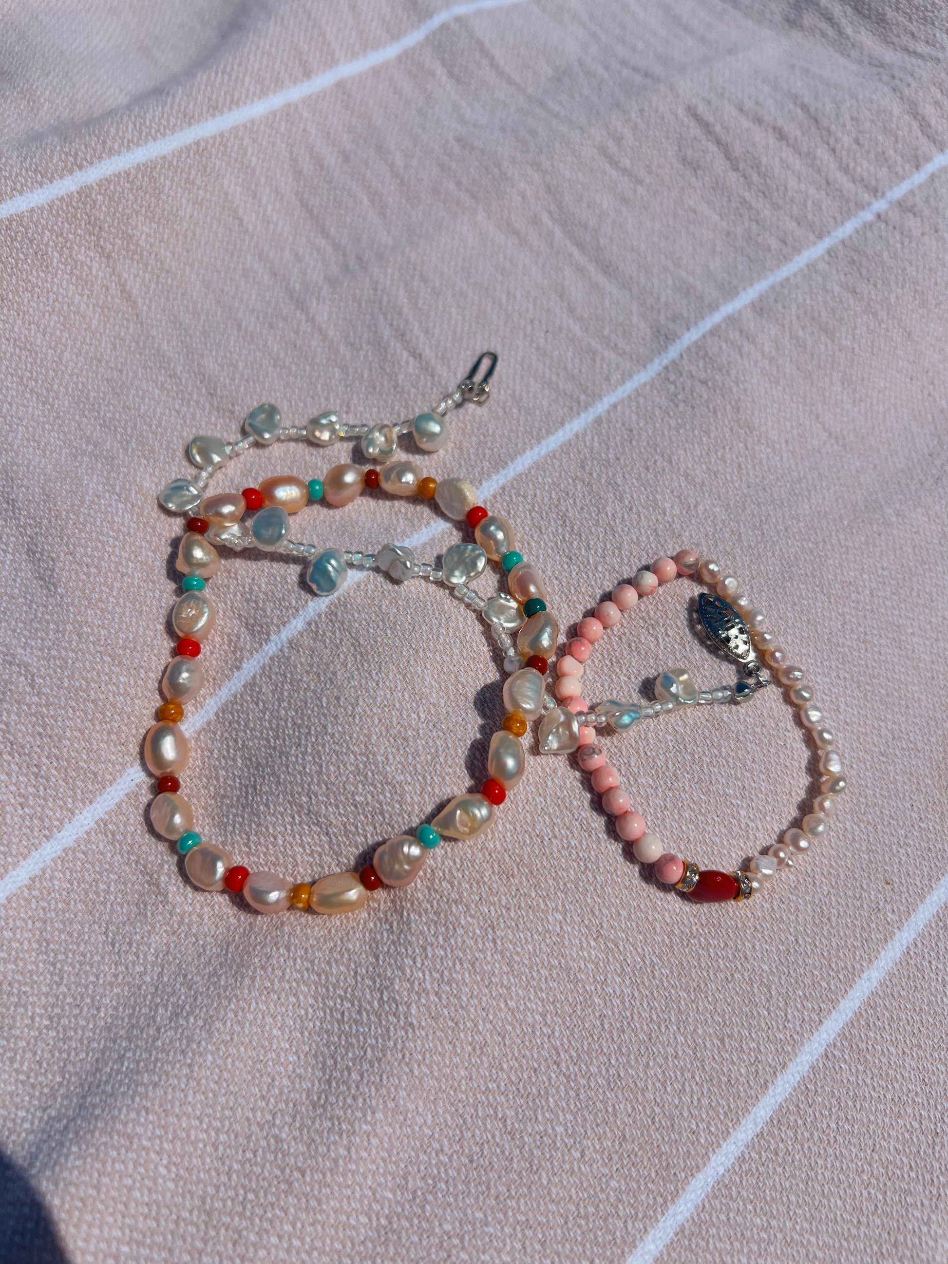 Pink Howlite beads with freshwater pearls and a red heart detail bead and 14k yellow gold single row pave diamond round spacer beads.